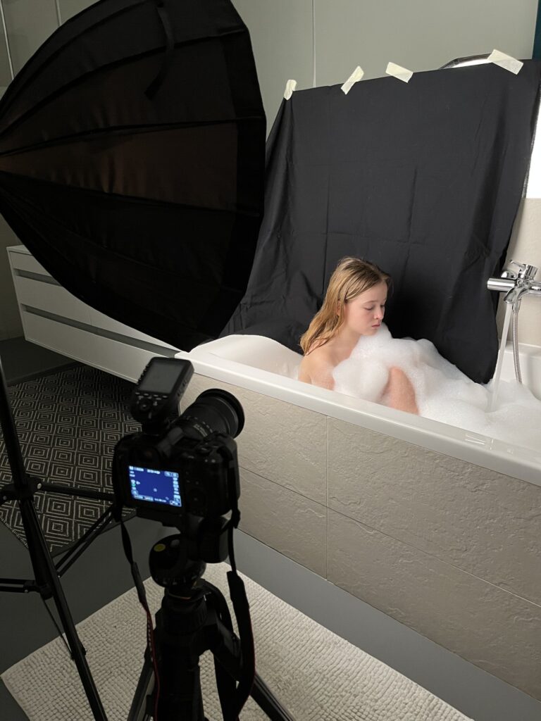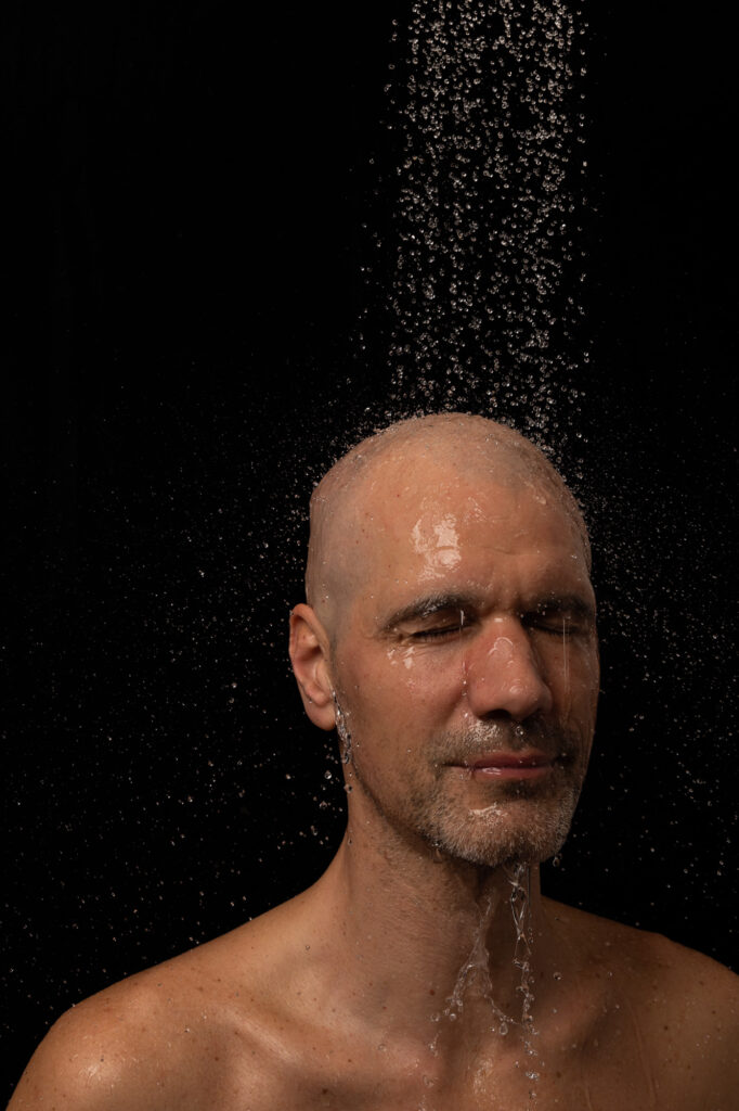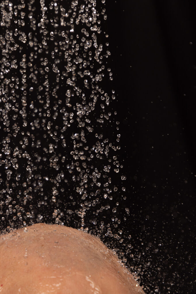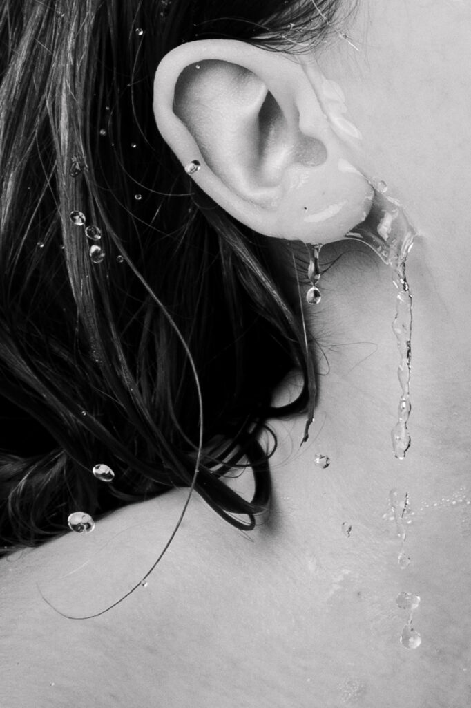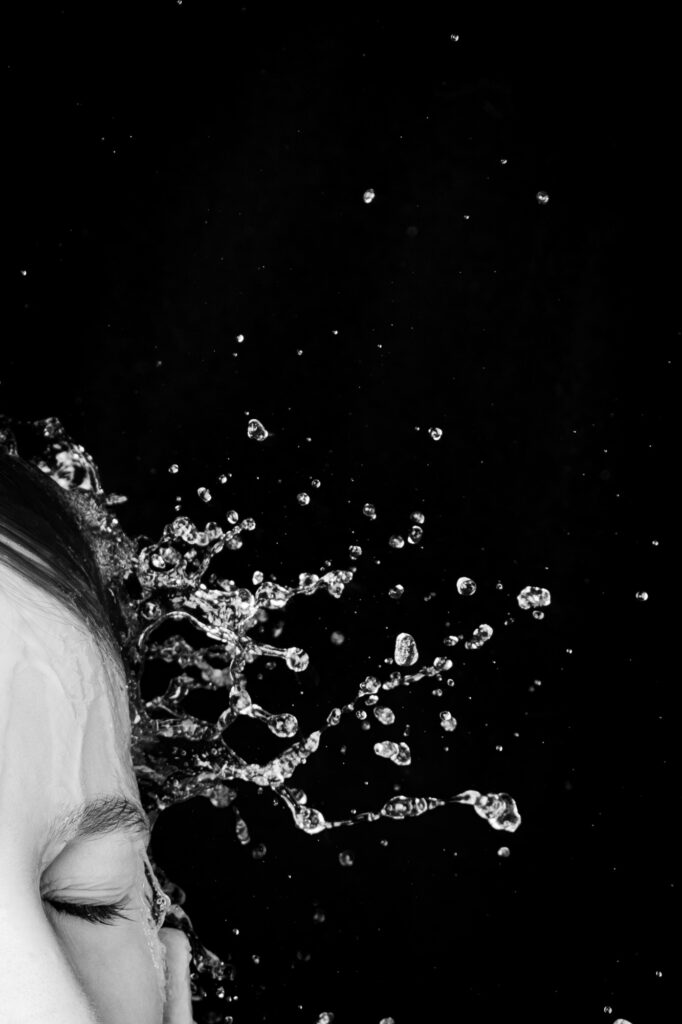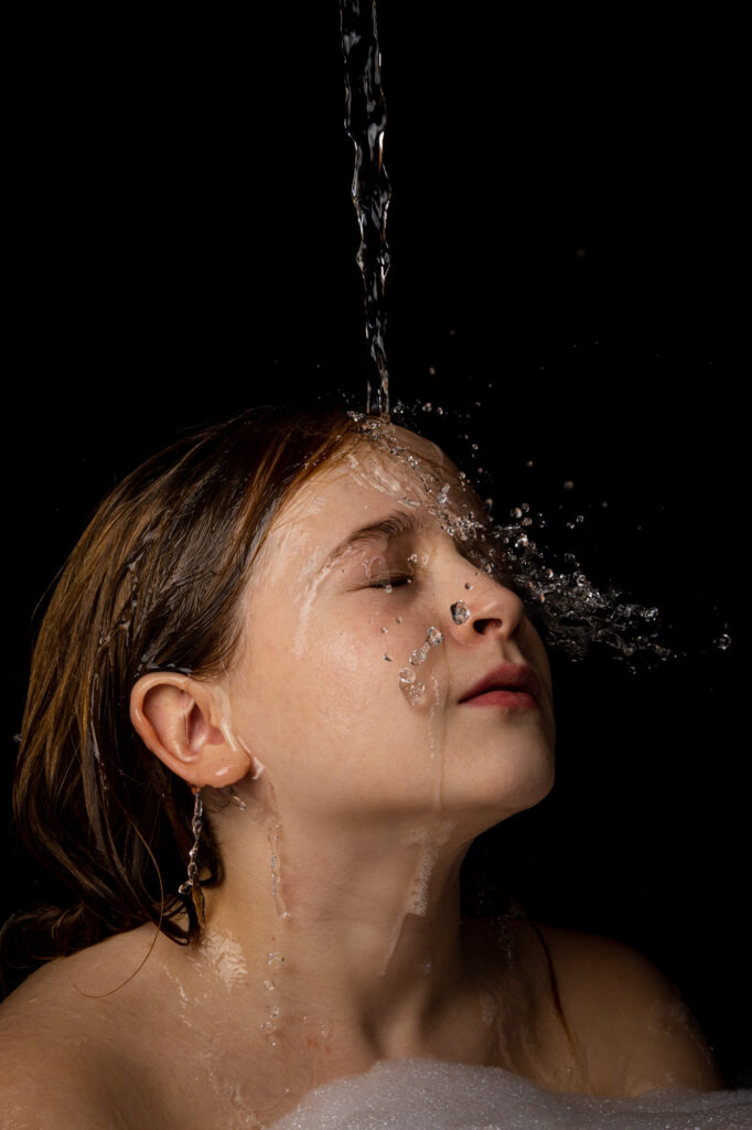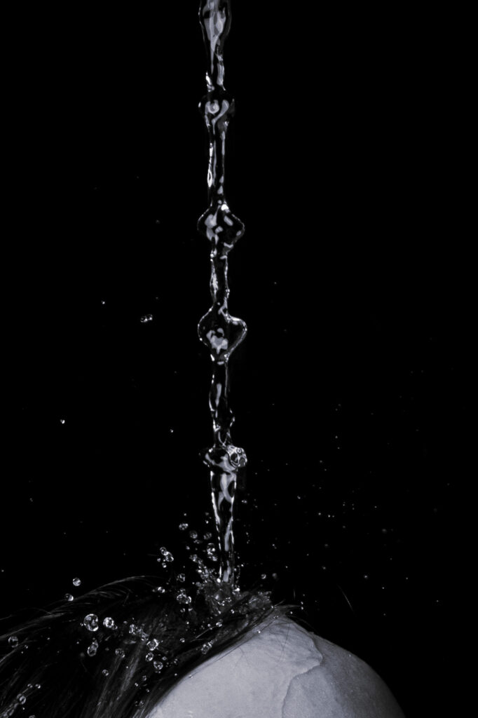 In meinen Aufnahmen friere ich die Bewegung von Wind und Wasser ein. Die Serie wurde in zwei verschiedenen Badezimmern mit sechs unterschiedlichen Models aufgenommen. Es wurde viel experimentiert, ausprobiert, geschüttet, geföhnt und gelacht bis ich zum gewünschten Ergebnis gelang. So entstanden 10 Farb- sowie 10 Schwarzweissaufnahmen die miteinander harmonieren.
