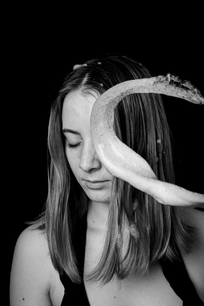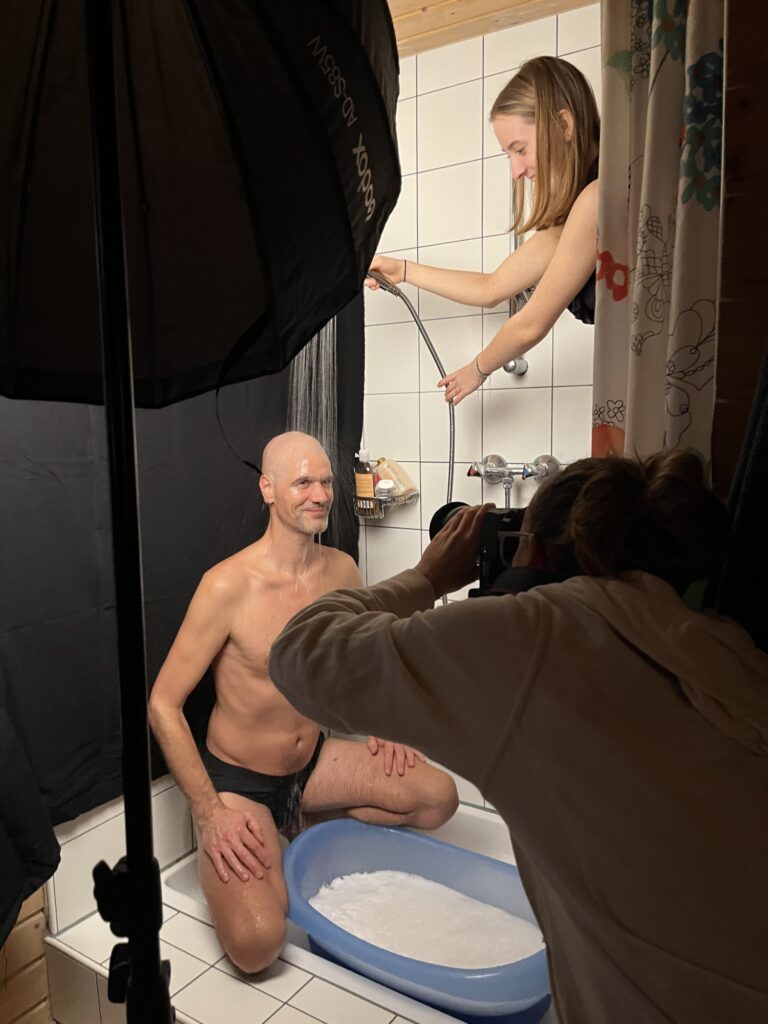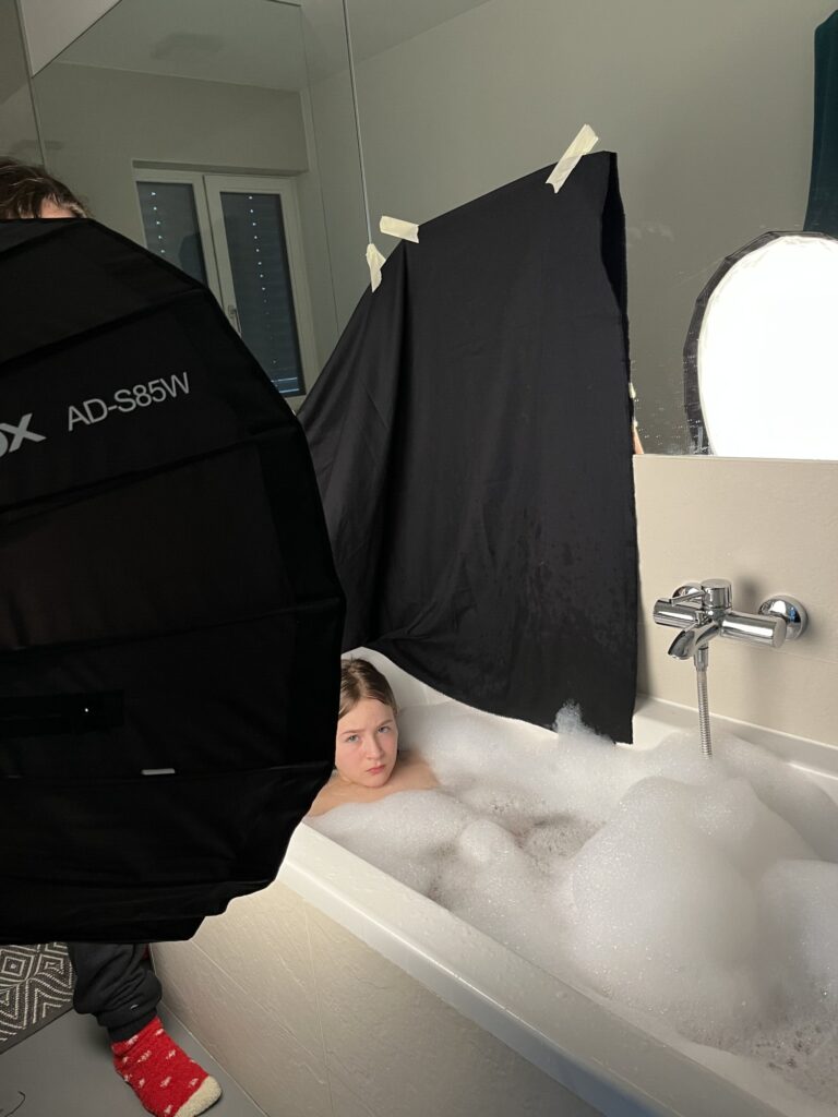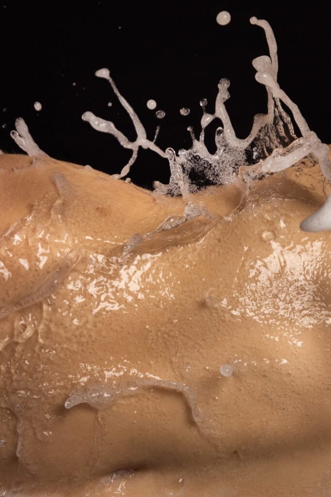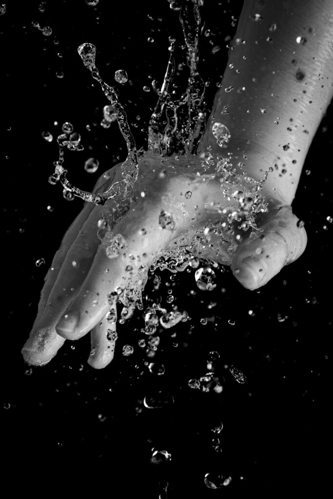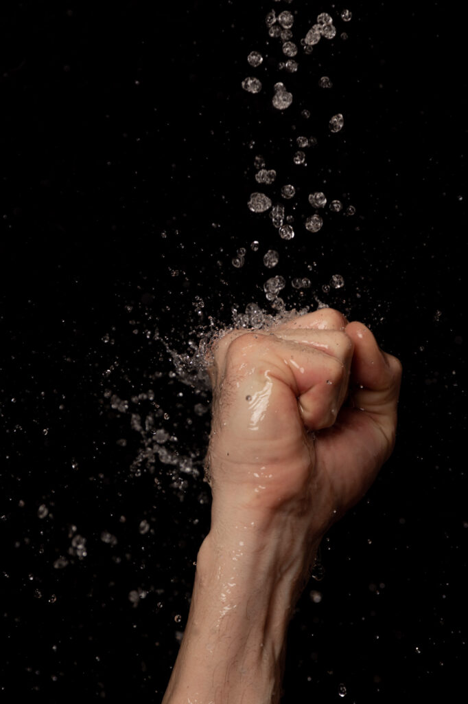In meinen Aufnahmen friere ich die Bewegung von Wind und Wasser ein. Die Serie wurde in zwei verschiedenen Badezimmern mit sechs unterschiedlichen Models aufgenommen. Es wurde viel experimentiert, ausprobiert, geschüttet, geföhnt und gelacht bis ich zum gewünschten Ergebnis gelang. So entstanden 10 Farb- sowie 10 Schwarzweissaufnahmen die miteinander harmonieren.