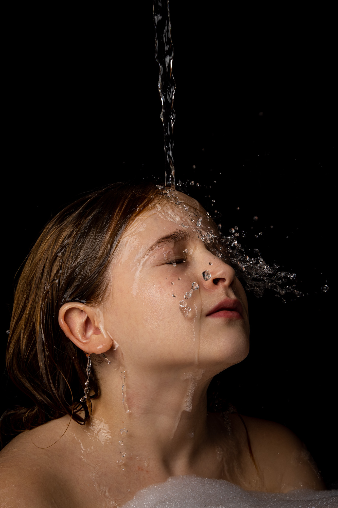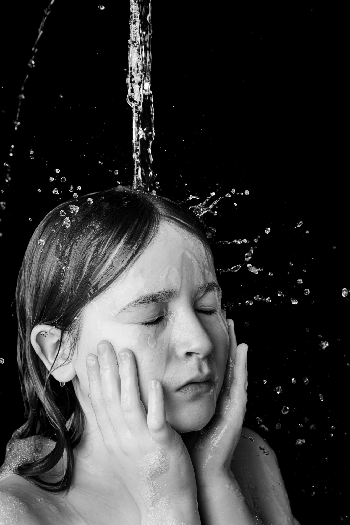 In meinen Aufnahmen friere ich die Bewegung von Wind und Wasser ein. Die Serie wurde in zwei verschiedenen Badezimmern mit sechs unterschiedlichen Models aufgenommen. Es wurde viel experimentiert, ausprobiert, geschüttet, geföhnt und gelacht bis ich zum gewünschten Ergebnis gelang. So entstanden 10 Farb- sowie 10 Schwarzweissaufnahmen die miteinander harmonieren.